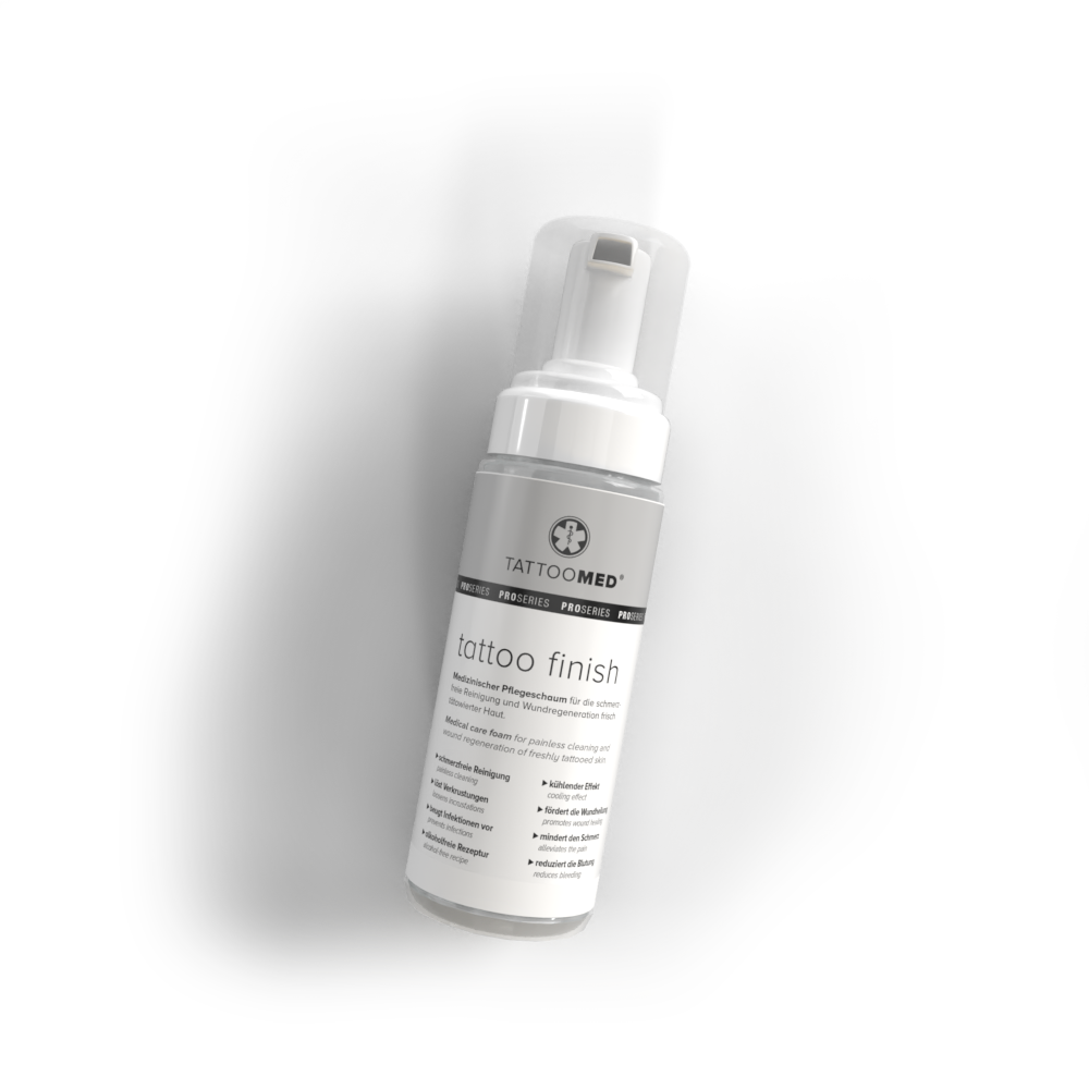 TattooMed Tattoo Finish ist die erste alkoholfreie Lösung zur Reinigung, Dekontamination, Befeuchtung und Heilung von akuten Wunden. Die einzigartige Kombination des enthaltenen Polyhexanid-Betain Komplex führt zu einer besonders effektiven Reinigung des frisch gestochenen Tattoos, reduziert die Keimbelastung und verhindert Entzündungen.